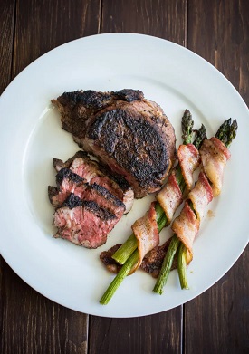 What to pair with? Hearty dishes like sausage and peppers, roasted lamb or beef stew would be lovely. And if you were in Evora, capital of the region? According to their tourism office, “Alentejo tradicional cuisine has, as a base, pork, lamb and bread. Always the bread. In special, older people never have a meal (not even a not at all traditional pasta) without a little bit of Alentejo bread.” Fresh herbs are an essential ingredient, including cilantro, mint and oregano along with the staples of olive oil, garlic and onion. The importer suggests a coffee-crusted prime rib with roast fingerling potatoes on the side. Yum. Click on the pic for a recipe. And yes, that is bacon-wrapped Asapragus!